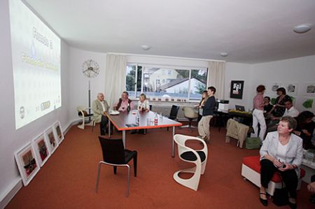 auf dem bild unten sieht man mein büro. und zwar mein büro am letzten freitag. es war noch früh, was man schemenhaft an der gleissenden helligkeit erkennen kann, die draussen herrscht. ein stuhl von philippe starck steht gelangweilt herum, während der weisse plastikstuhl wohl gerade die mutter von r.k. anbaggert. es stehen mareike von moois und ulrike die nussknackerin aus frankfurt am main vor meinem tisch herum, während pieter lugtenburg von lugtenburgparkett sitzt und rückenschmerzen hat. die bilder des künstlers rainer zamojre stehen auf dem boden, weil die wand links als projektionsfläche missbraucht wurde. durch besondere aufnahmetechniken der fotografin jana kay (aus verständlichen gründen nicht im bild) wirkt mein büro so groß wie ein flugzeughangar, doch der schein trügt. auf dem bild kann man meinen kamin leider nicht sehen. man kann auch frau claudia heimann von goldlilie (vergl. mit frau auf fahrrad am burger king drive-inn) nicht sehen, sie steht unten am sektstand und macht sich nützlich (danke!). der kamin, den man nicht sieht und frau claudia heimann, die man ebenso nicht sehen kann werden am samstagabend sich gegenseitig zum knistern bringen. frau claudia heimann wird dann mit vorausgestreckten händen am lodernden kaminfeuer stehen und singen. danach schlage ich vor, dass wir unsere zäpfchen mittels handykamera fotografieren, danach gehts in den schlachthof, denn man wohnt ja schließlich in der provinz. man hat ja sonst nichts anderes. so und das war jetzt so richtig sinnfremd und alles ohne zusammenhang. ich bedanke mich für ihre aufmerksamkeit.